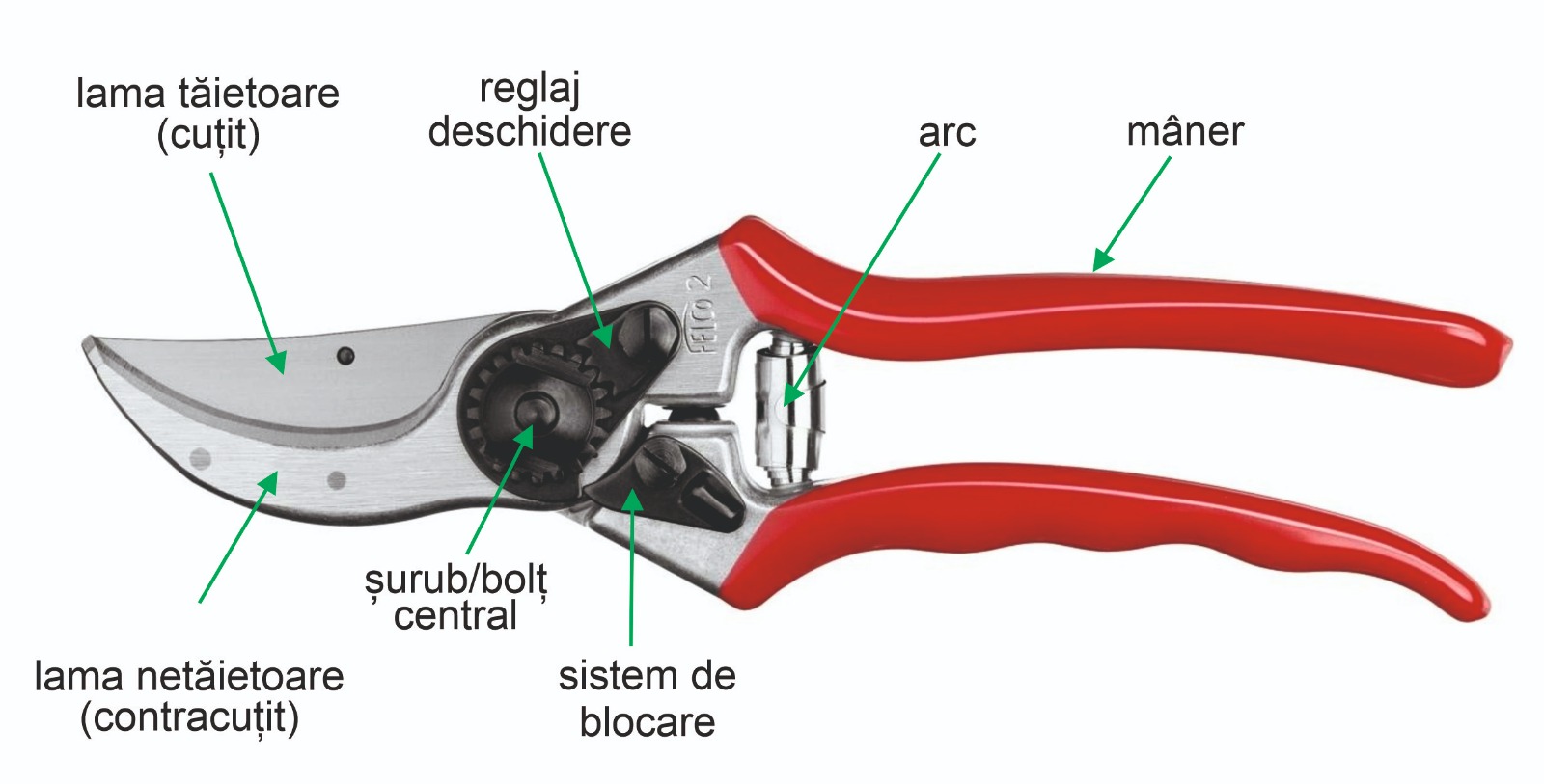 Foarfeca tip bypass (cu tăiere curbată), care este ideală pentru lemn tânăr, deoarece oferă o tăiere curată, fină, care se vindecă repede.